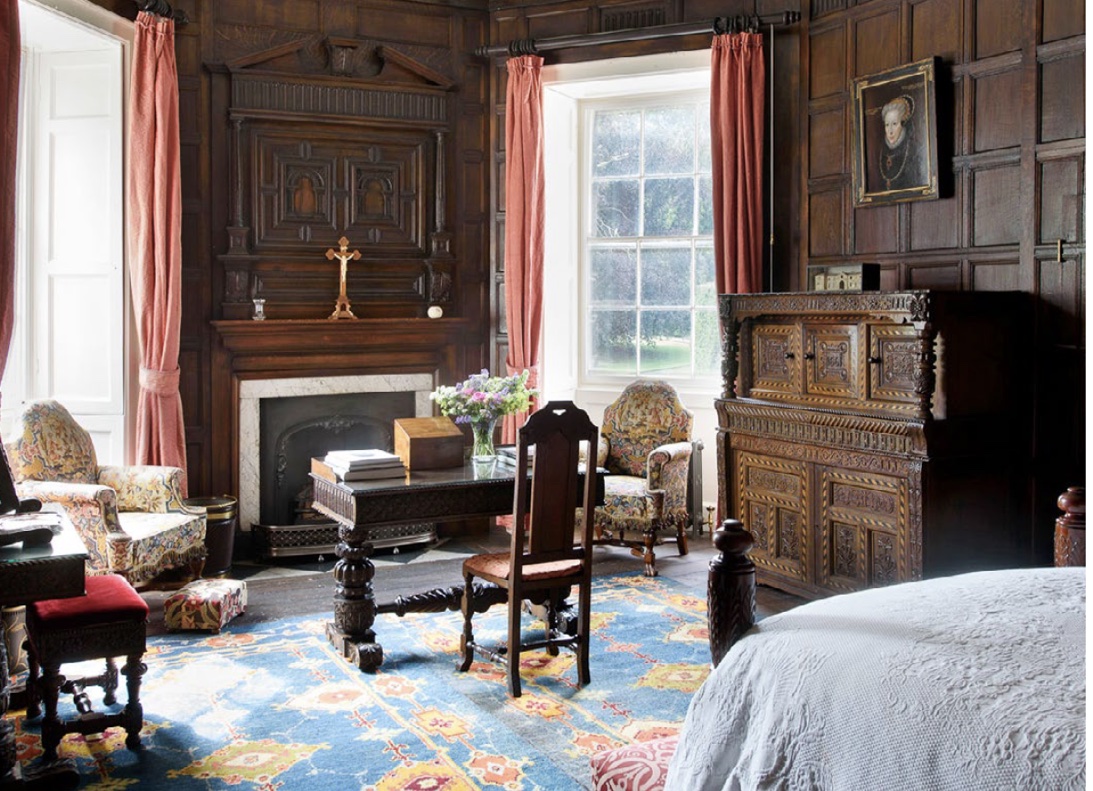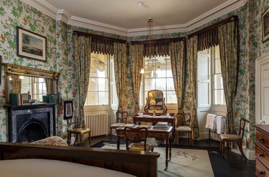 Room price: £272. Suitable for couple. South facing with views over the gardens and conservatory. Wood paneled room with super king-sized bed. Uses Gillow’s bathrooms.